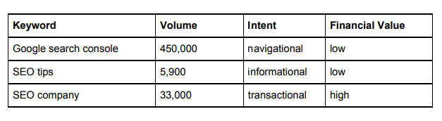 这里我们有三个关键词,涵盖了一系列导航,信息和商业意图。让我们分析每种类型的价值: