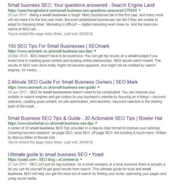 但是,如果我们使用Google搜索术语“小企业SEO”,那么一旦您通过广告,我就不会看到太多的商业结果。实际上,返回的内容几乎都是信息性的。