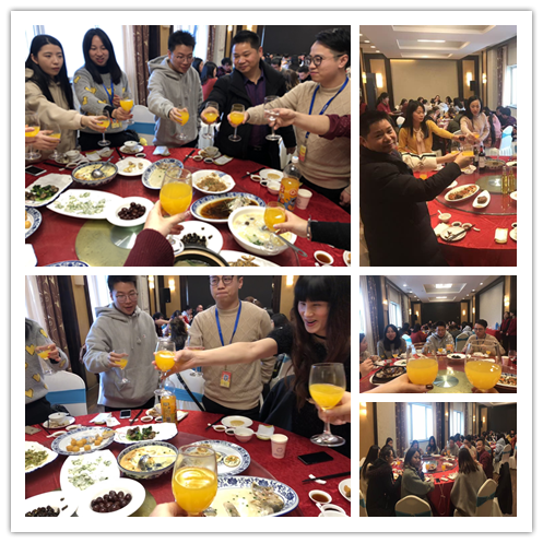 午宴部分,公司领导亲切与员工互动,感谢过去一年各位员工对公司的辛勤付出,嘱咐大家吃好、喝好、玩好。